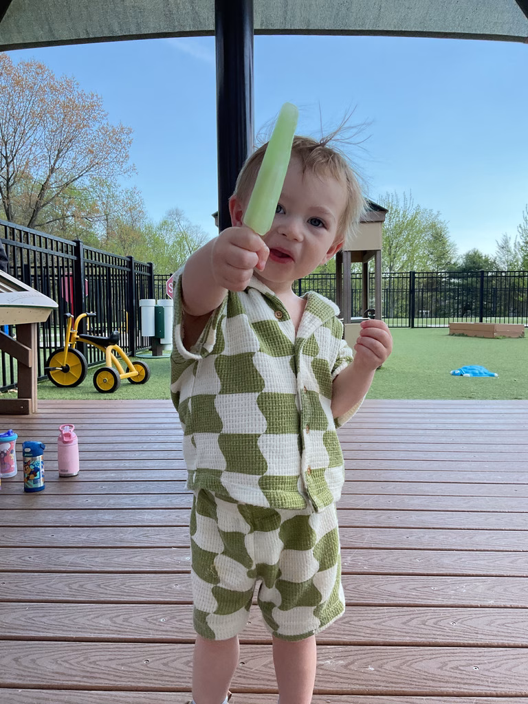 - Younger children cooled off outside with ice pops on a warm, sunny day.