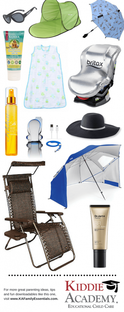 Dr. Jart Beauty Balm with SPF 45, This one-step balm perfects the appearance of the skin while protecting it from the sun with built-in SPF 45 coverage. It’s a moisturizer, sunscreen and treatment serum all in one with a lightweight formula that doesn’t feel like wearing sunscreen at all;   Anti-Gravity Chair with Sunshade, These innovative gravity free lounge chairs release stress and tension with their ergonomic design. They also keep you out of the sun;    Sport-Brella Umbrella, This umbrella offers instant protection from the sun, light rain and wind when you’re on the beach. It also provides enough air flow to keep cool under the sun even when the temperature is at its hottest;    Fekkai Pre Soleil Hair Mist, When a chic wide-brimmed hat just won’t do, spritz your locks with this pre-sun mist from Fekkai. With hydrating sunflower seed oil and an invisible UV filter, it promises to minimize color fade and keep hair hydrated, while adding shine and a subtle citrus scent;    Car Seat Sun Shade, Using a sun shade over your little one’s car seat is a great way to keep your car seat cool and to it protect from damaging UV sun rays. That way when a child climbs up to get in, they are not burned or find the seat too hot to sit in;    Baby Sun Tent, This tent is a great alternative to putting creams or lotions on a baby’s sensitive skin and it’s ideal to take camping, traveling and hiking all summer long;    Universal Stroller Umbrella, This handy parasol can be attached to any stroller to provide shade and flexible UV ray protection for your little one during stroller rides on sunny days;    Stroller Fan, This stroller fan takes 4 rechargeable batteries (included) and a USB AC Wall charger. The fan has more than 5 hours of battery life on high settings and 9 hours on medium settings. For trips to Disney, Hawaii, the beach or just the neighborhood summer concert or movie night, this can be a life saver when your little ones are hoping to keep cool;    Crescent Beach Sun Hat, When the weather warms up, this sun hat with an extra-wide brim is easy-to-pack and its foldable material is the ideal packable accessory for a day in the sun;    Muslin Sleep Sack, Summer is here and it’s time to transition baby from those fleece-lined sleep sacks and footie-PJs to more breathable materials they’ll (hopefully) sleep all night in;    Badger Balm, Powered by zinc oxide, all-natural cream from Badger Balm is certified as 94 percent organic. Not only are the plant-oils, like sunflower and jojoba, super moisturizing, but the lotion is also water resistant up to 40 minutes;    Babiators, Babiators sunglasses for babies and kids have 100% UV protection and flexible, durable frames. They’re also stylish so your little one will be the coolest kid around.