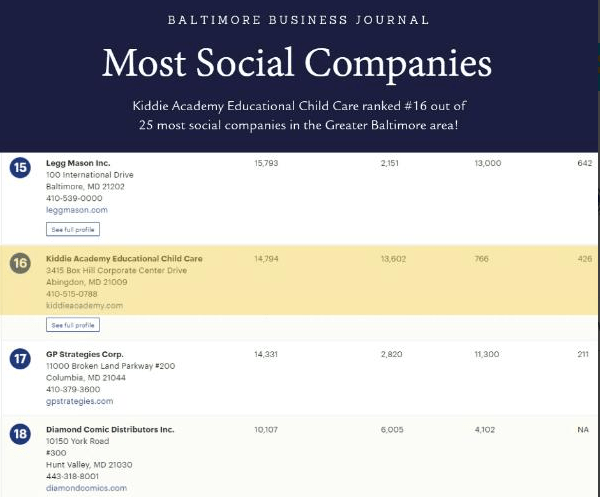 The Baltimore Business Journal has named Kiddie Academy® one the most social companies in the Greater Baltimore area. The BBJ ranking is based on the number of followers and likes on social media.